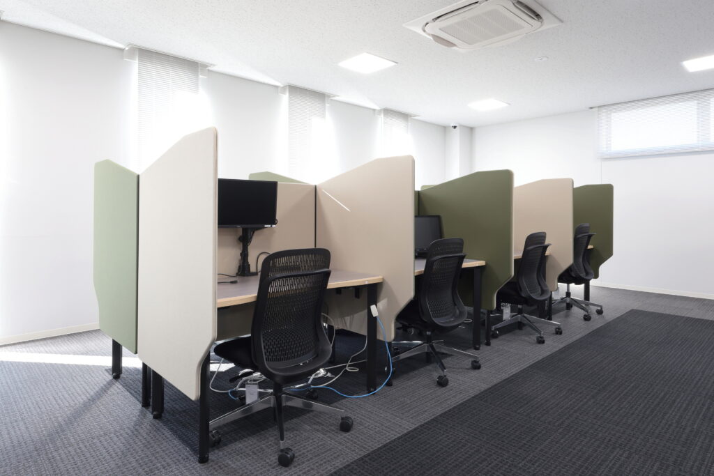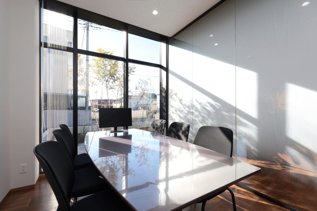 明るい木目のパネルで入り口のミーティングコーナーとデスク空間を分けて、執務に集中できるレイアウトです。