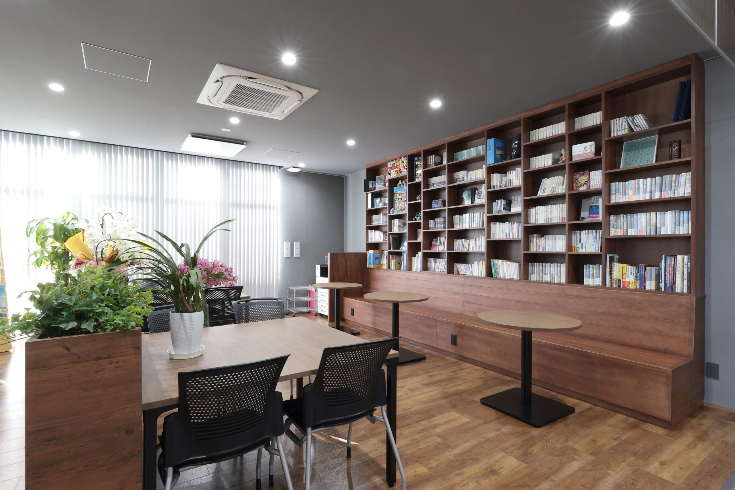 明るいホワイトを基調に、活気が出る赤いメッシュチェアーをアクセントにレイアウトしました。収納庫が通路との境界になっています。