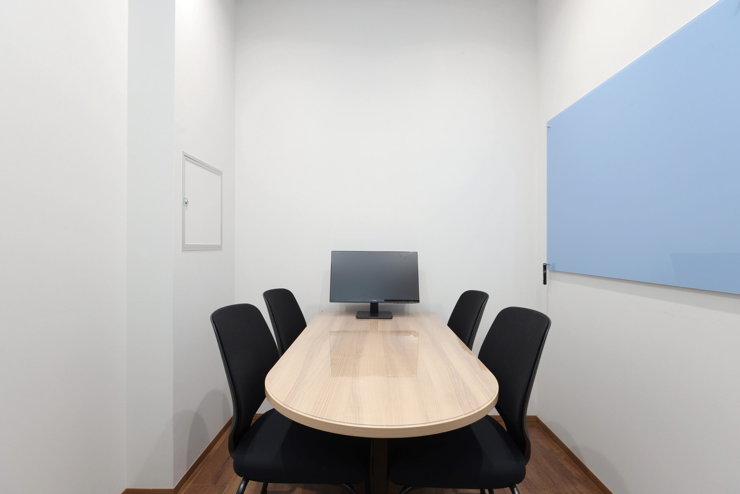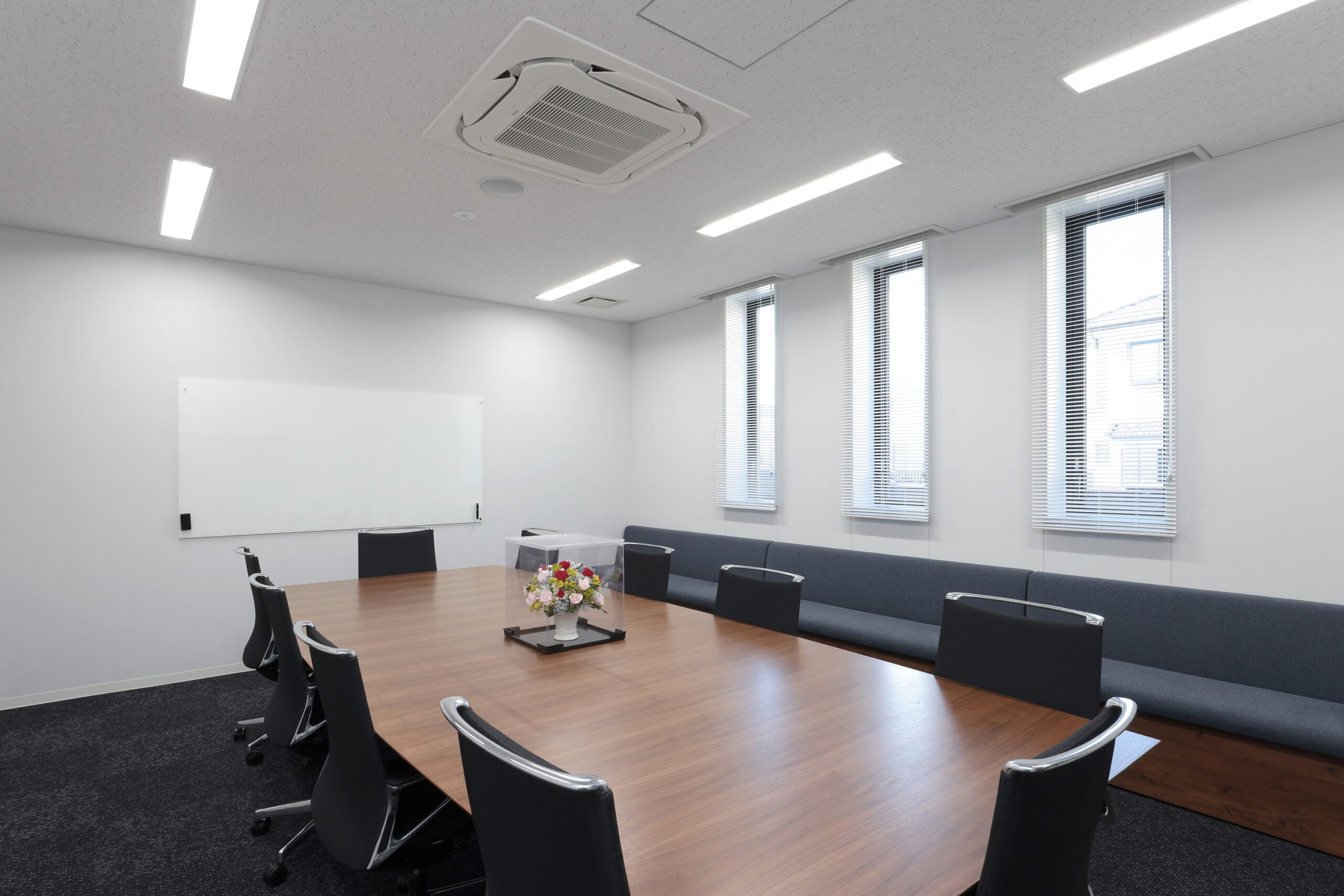 シックで落ち着いた会議室。中央にモニター、ネットワーク、電源のケーブルを配線できるダクト付きのテーブルです。