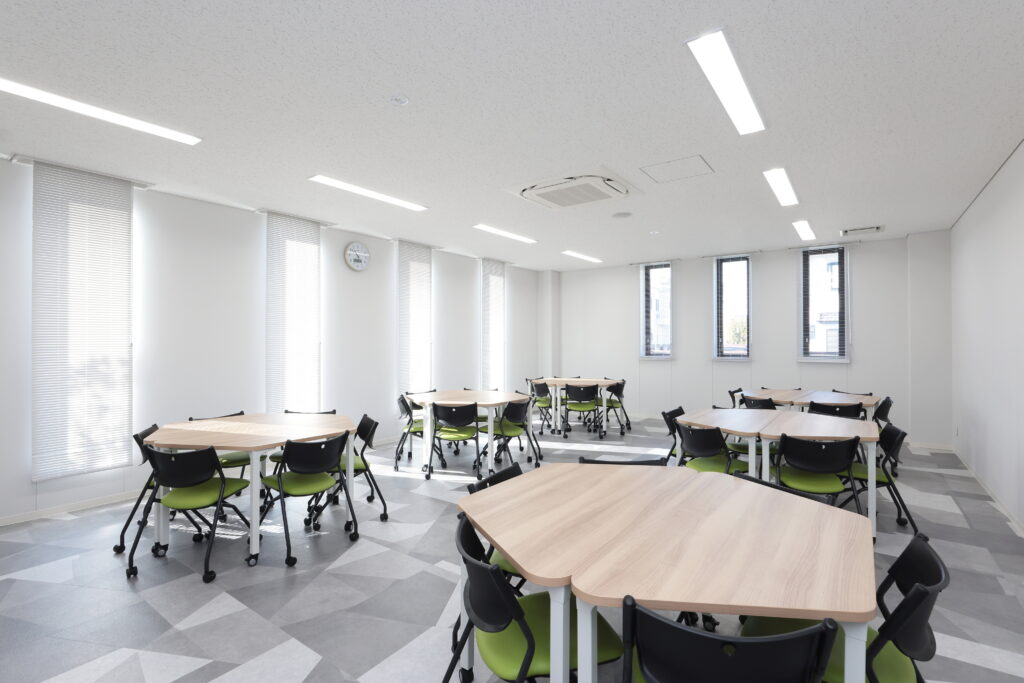 明るい木目に囲まれて、学生がそれぞれ集中して勉強できるブースです。硬質の床でも安定していて軽い椅子を組み合わせています。